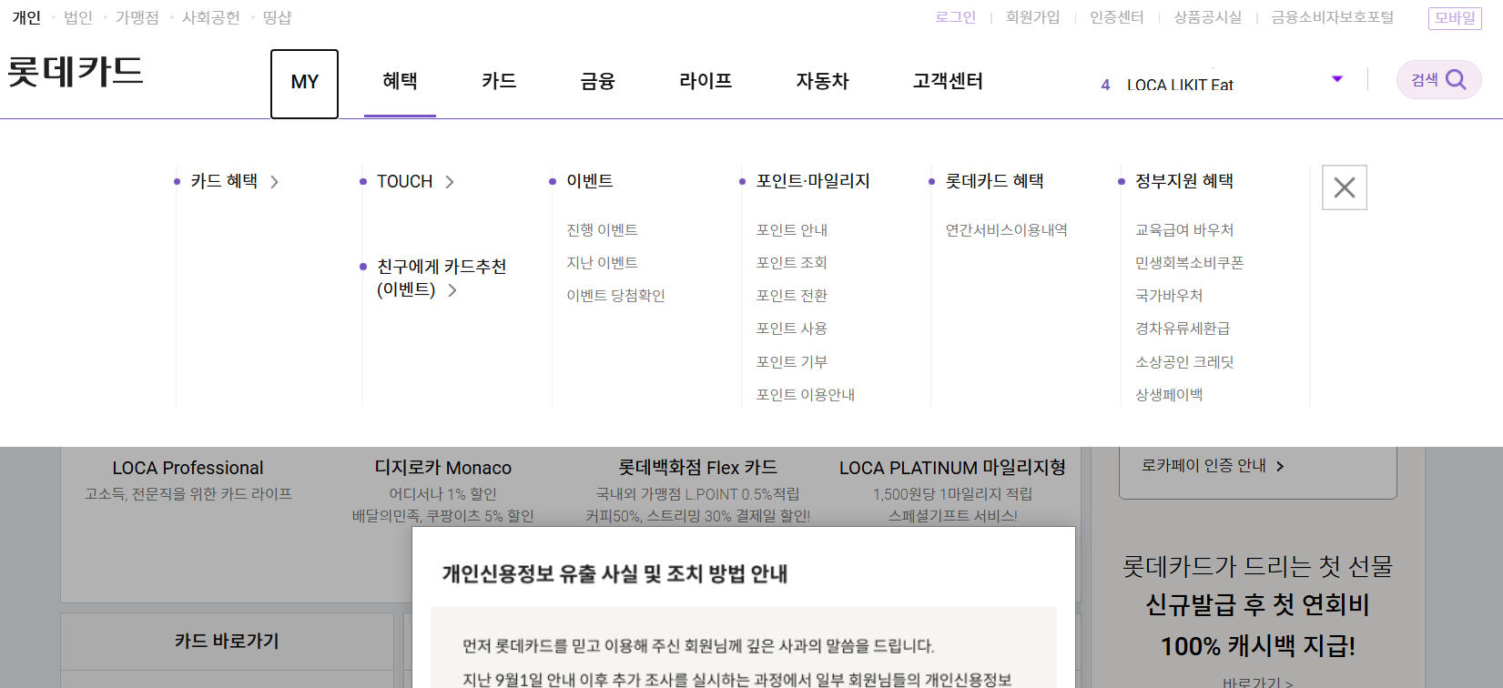 - 롯데카드 홈페이지 접속 후 로그인