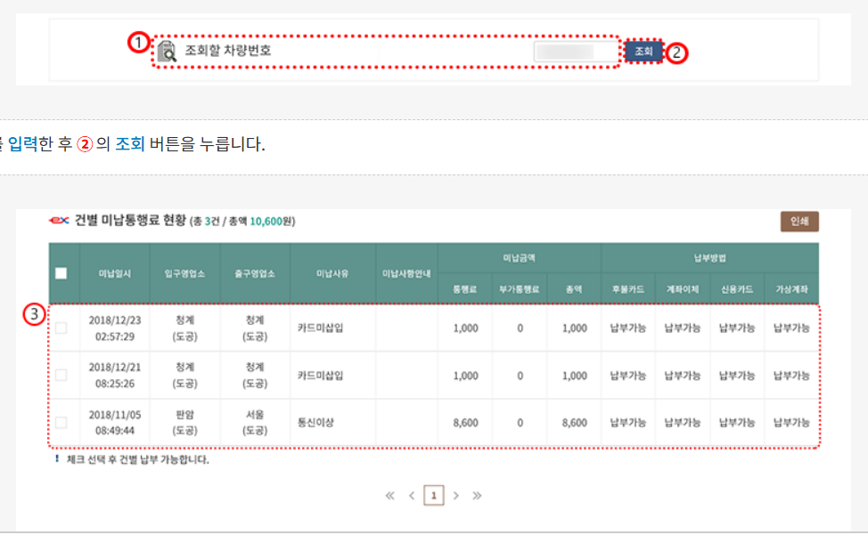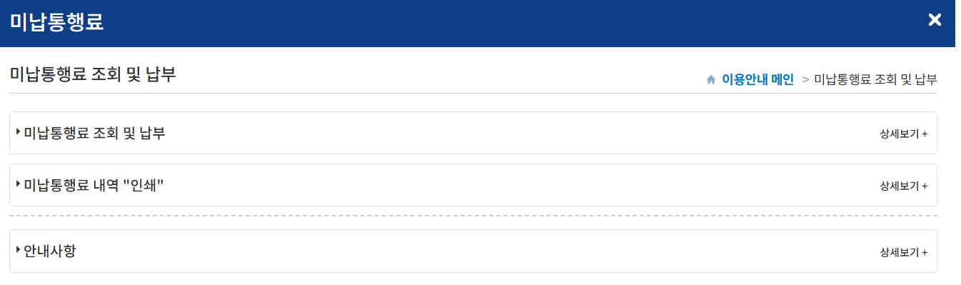 - 조회 절차: 미납 통행료 조회 → 차량번호 입력 → 본인 인증